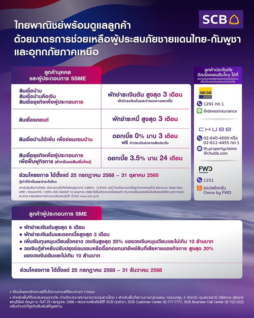 ทั้งนี้ ลูกค้า SME ที่ต้องการซ่อมแซมสถานประกอบการไม่ว่าจะเป็นด้วยอุทกภัยหรือสถานการณ์ความไม่สงบชายแดนไทย-กัมพูชา สามารถขอสินเชื่อเพื่อฟื้นฟูกิจการเพื่อ SME ระยะเวลากู้สูงสุด 10 ปี ดอกเบี้ยคงที่ 3.5% ต่อปี เป็นระยะเวลา 2 ปี และชำระแบบปลอดเงินต้นนานสูงสุด 12 เดือน โดยหลักเกณฑ์และเงื่อนไขการพิจารณาสินเชื่อเป็นไปตามที่ธนาคารกำหนด