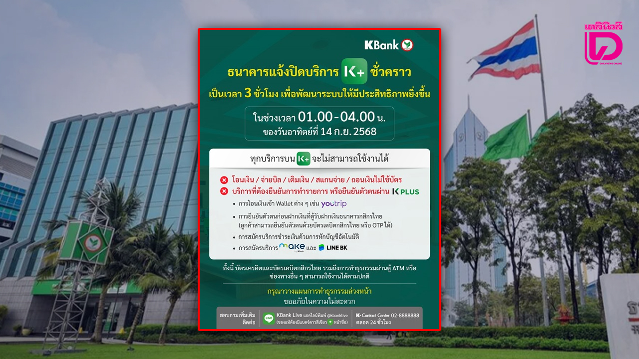 ธนาคารแจ้งปิดบริการ K PLUS ชั่วคราว เป็นเวลา 3 ชั่วโมง เพื่อพัฒนาระบบให้มีประสิทธิภาพยิ่งขึ้น ในวันอาทิตย์ที่ 14 กันยายน 2568 เวลา 01.00–04.00 น. ส่งผลให้ทุกบริการบน K PLUS จะไม่สามารถใช้งานได้ (ไม่สามารถโอนเงิน จ่ายบิล เติมเงิน สแกนจ่าย และถอนเงินไม่ใช้บัตร) รวมถึงบริการที่ต้องยืนยันการทำรายการ หรือยืนยันตัวตนผ่าน K PLUS จะไม่สามารถใช้งานได้ เช่น