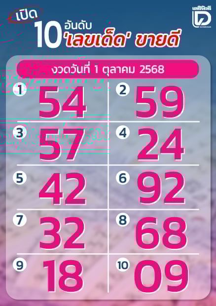 เมื่อจัดลำดับความนิยมของเลขดัง 10 อันดับ พบมีดังนี้ อันดับ 1 เลข 54 อันดับ 2 เลข 59 อันดับ 3 เลข 57 อันดับ 4 เลข 24 อันดับ 5 เลข 42 อันดับ 6 เลข 92 อันดับ 7 เลข 32 อันดับ 8 เลข 68 อันดับ 9 เลข 18 และอันดับ 10 เลข 09